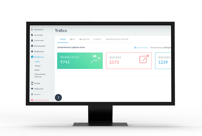 Utiliza la herramienta Estadísticas de Nattiva y analiza el número de lanzamientos, sesiones únicas, páginas vistas… Filtra tus resultados por periodo o por plataforma. No hay límite de tiempo para mantener las estadísticas de tu aplicación. Exporta las estadísticas de tu aplicación en formato .csv para tu posterior análisis en otra herramienta.