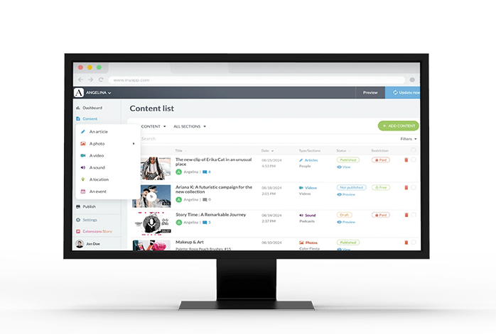 Nattiva CMS (Content Management System, Sistema de Gestión de Contenidos) es un sistema de gestión de contenido que te permite crear, editar, organizar y publicar contenido en tu aplicación. Es una potente herramienta con la que puedes crear todo tipo de contenido directamente desde el back office: Artículos, Vídeos, Sonidos, Fotos, Mapas, Formularios, Eventos…