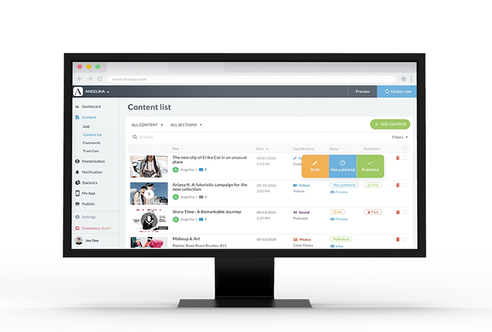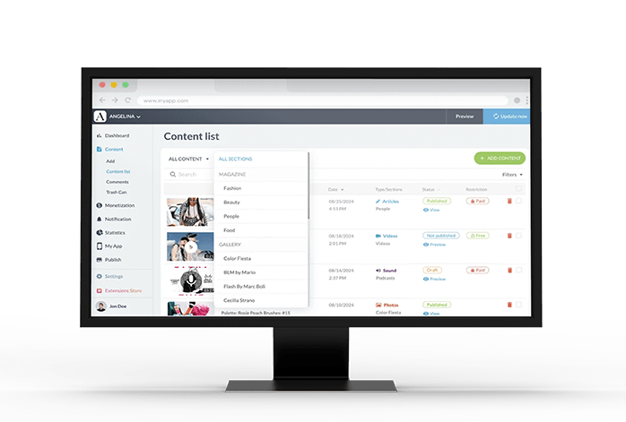 Accede a una página dedicada para administrar todo el contenido creado con el CMS. Este panel cuenta con filtros inteligentes para ayudarte a encontrar fácilmente el contenido que estás buscando. Puedes crear un número ilimitado de categorías para clasificar el contenido de una sección, facilitando la organización de tu contenido y la lectura de tus usuarios. Puedes gestionar fácilmente la activación y desactivación de cada categoría y el movimiento de elementos de una categoría a otra.